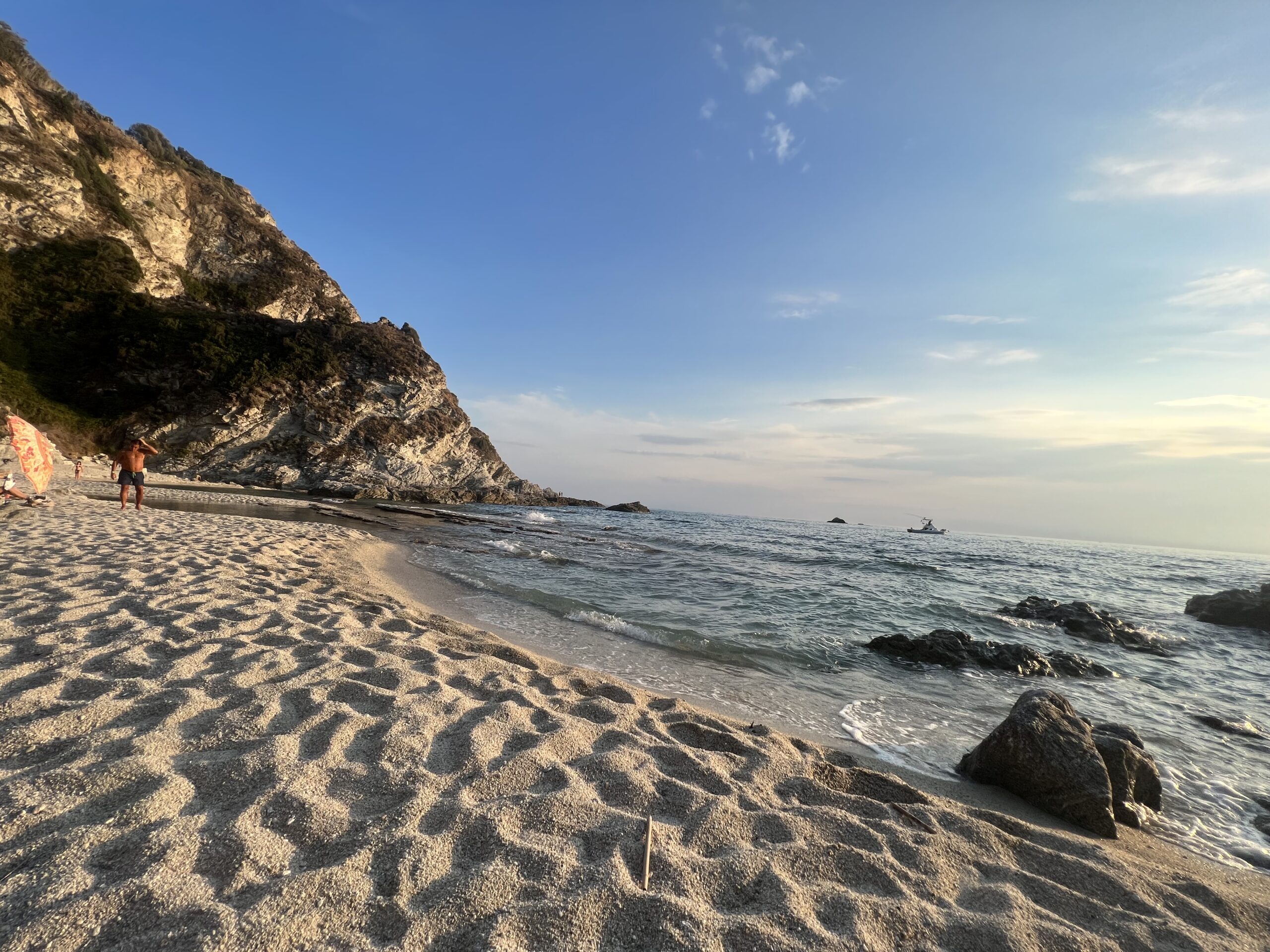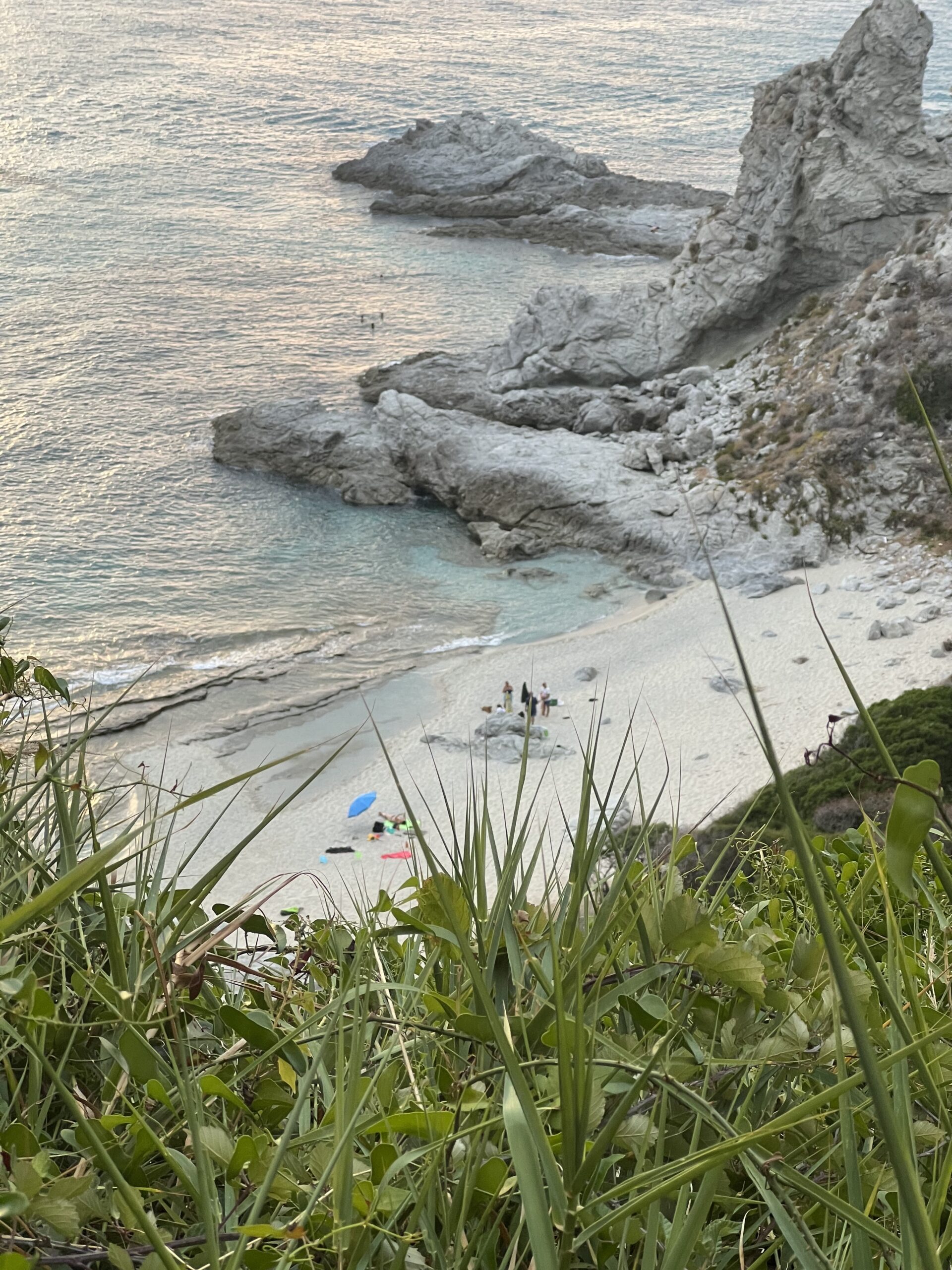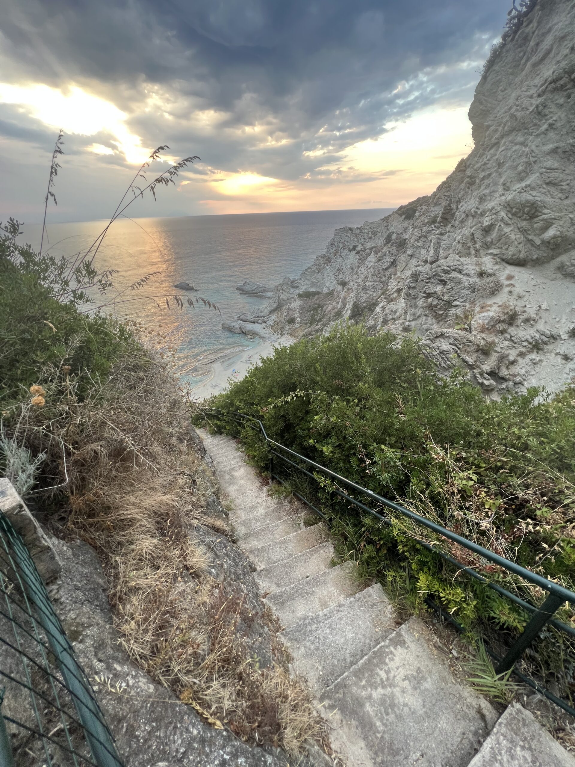 We are now good to go…..Tropea, here we come!! We were only 3 hours late. This seaside place is stunning. The ride from Rome was not bad at all until we were in the middle of a complete Florida summer thunder/lightning storm. Everyone around us was pulling off the side, it was wicked windy. The lightning was terrifying! But, thank God it cleared up just in time for our arrival at the beach. I found this Airbnb when I was searching for places for Michael and Mary Sloan to go for their honeymoon. It’s a beautiful little villa with direct access to a private beach. A beach that requires a journey of 400 steps DOWN……
