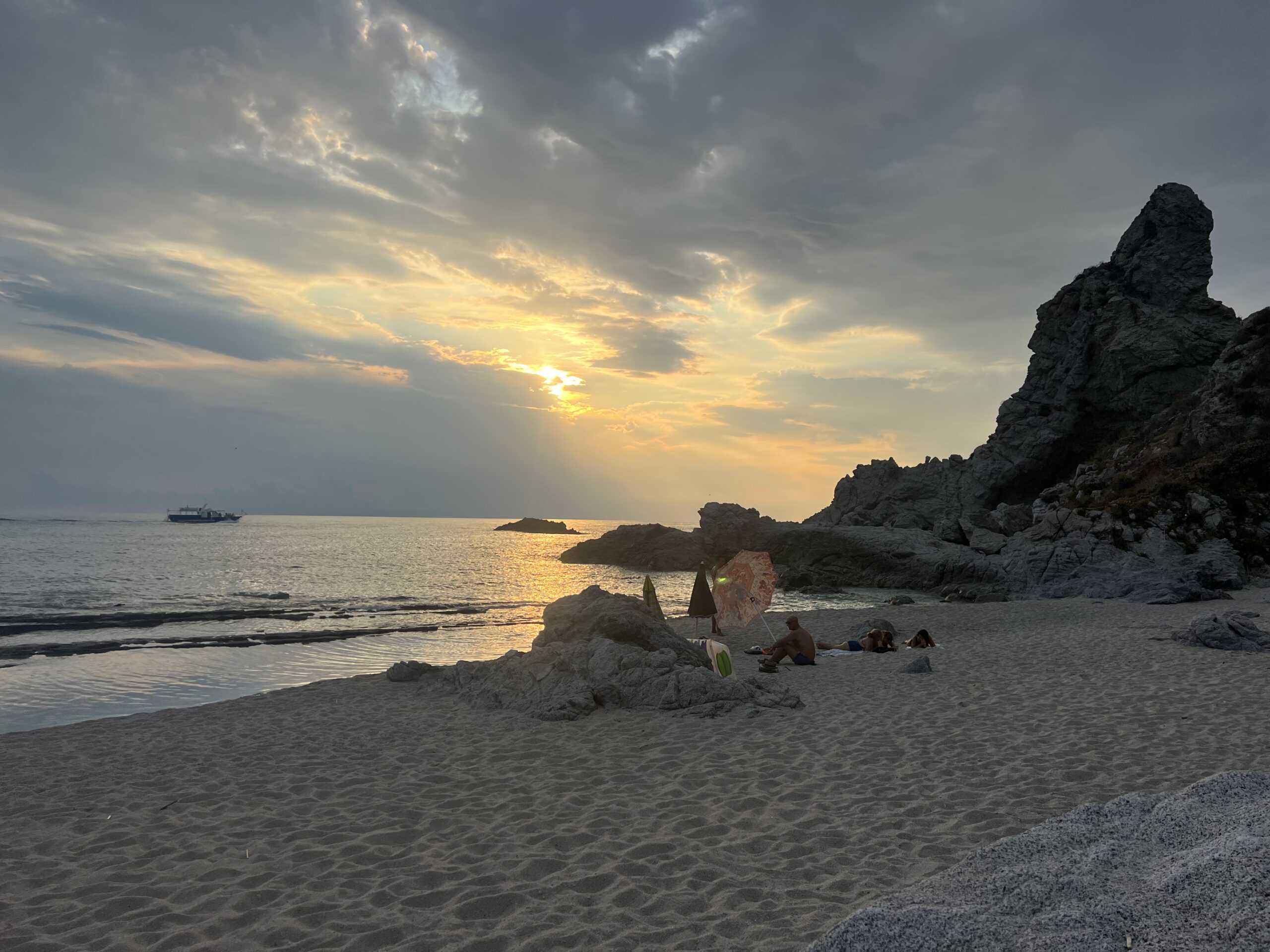 This gorgeous property consists of multiple little villas. They each have their own patio and a tremendous view of the Tyrrhenian Sea. A short walk down a path takes you to a stairway of 400 steps. Leading down these steps gives you direct access to a private beach. The beach is only accessible via these steps or by boat. Each step I felt my happiness returning. I can hear the sound of the ocean smashing against the rocks… I am in my happy place. The ocean is my first love. We grew up spending summers on our boats traveling from Boston to Maine and everywhere in between. We make our way down and are absolutely blown away. There are 4 other people on the beach. It’s absolutely perfection. There are no words to describe how magnificent this place is. It is just beautiful. Truly God’s masterpiece.