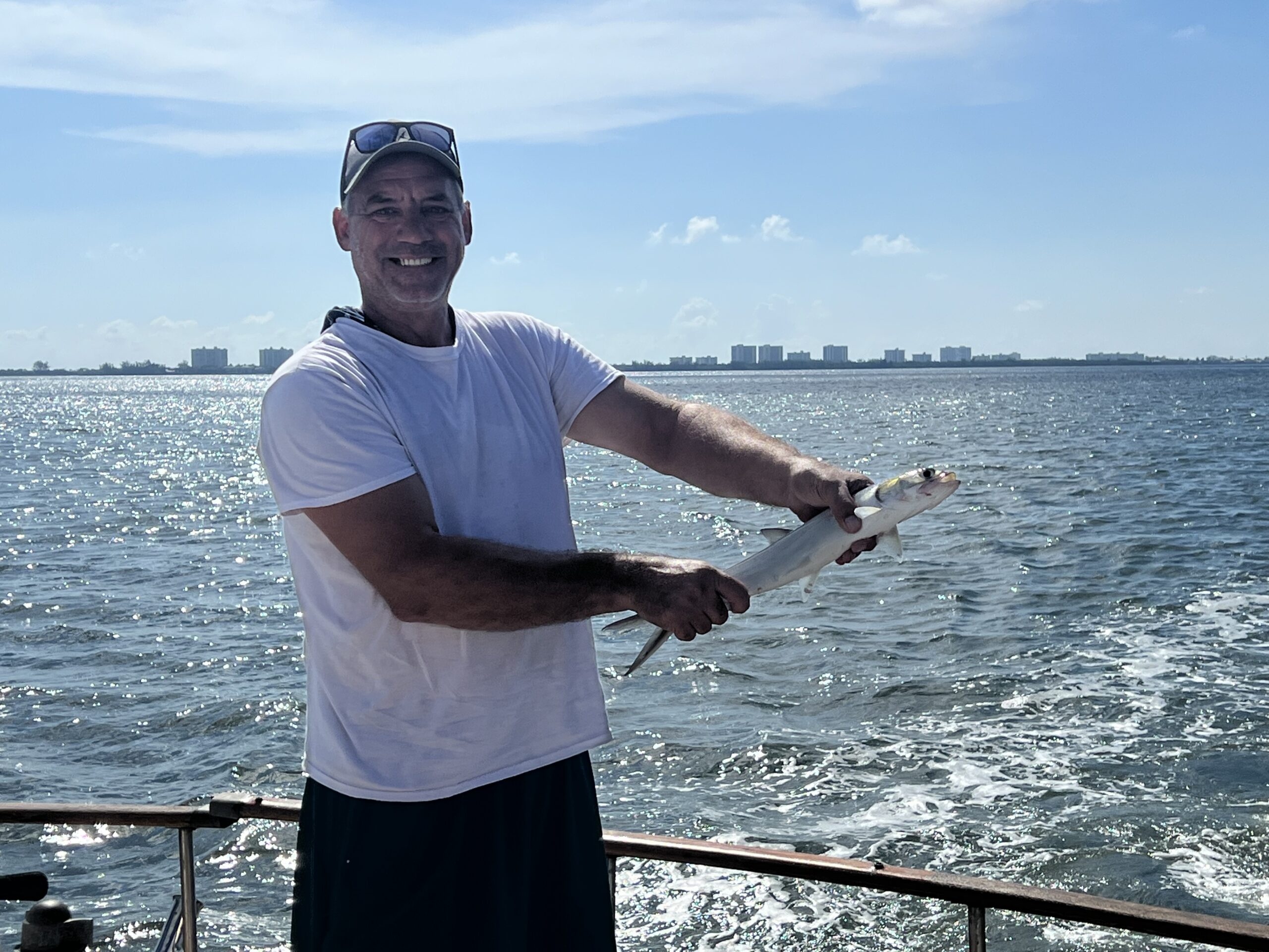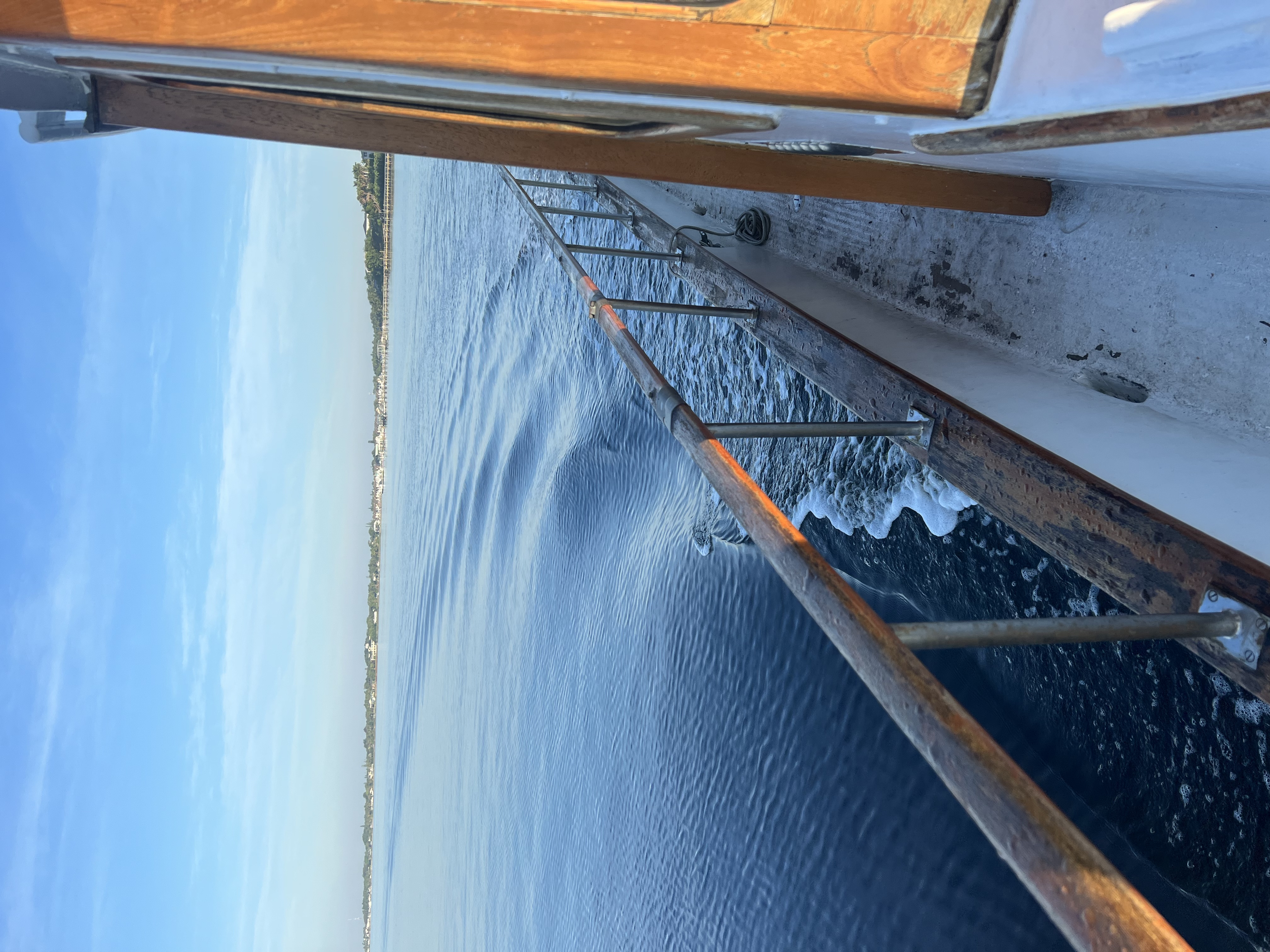So, we are now the proud owners of a boat that I know we can restore to her former beauty! The teak work is going to look amazing once sanded, stained, and varnished. The decks will require some maintenance and the leaks addressed. That will be Mike’s first job to stop the leaks! But, on Sunday as we were making our way north on the intercoastal, Mike caught his first fish on board!! A ladyfish. He was just a little excited. This will be his relaxation. After a long exhausting week at work, he looks forward to sitting on the boat and fishing until his heart is content. I look forward to watching him relax. We both are in this together!