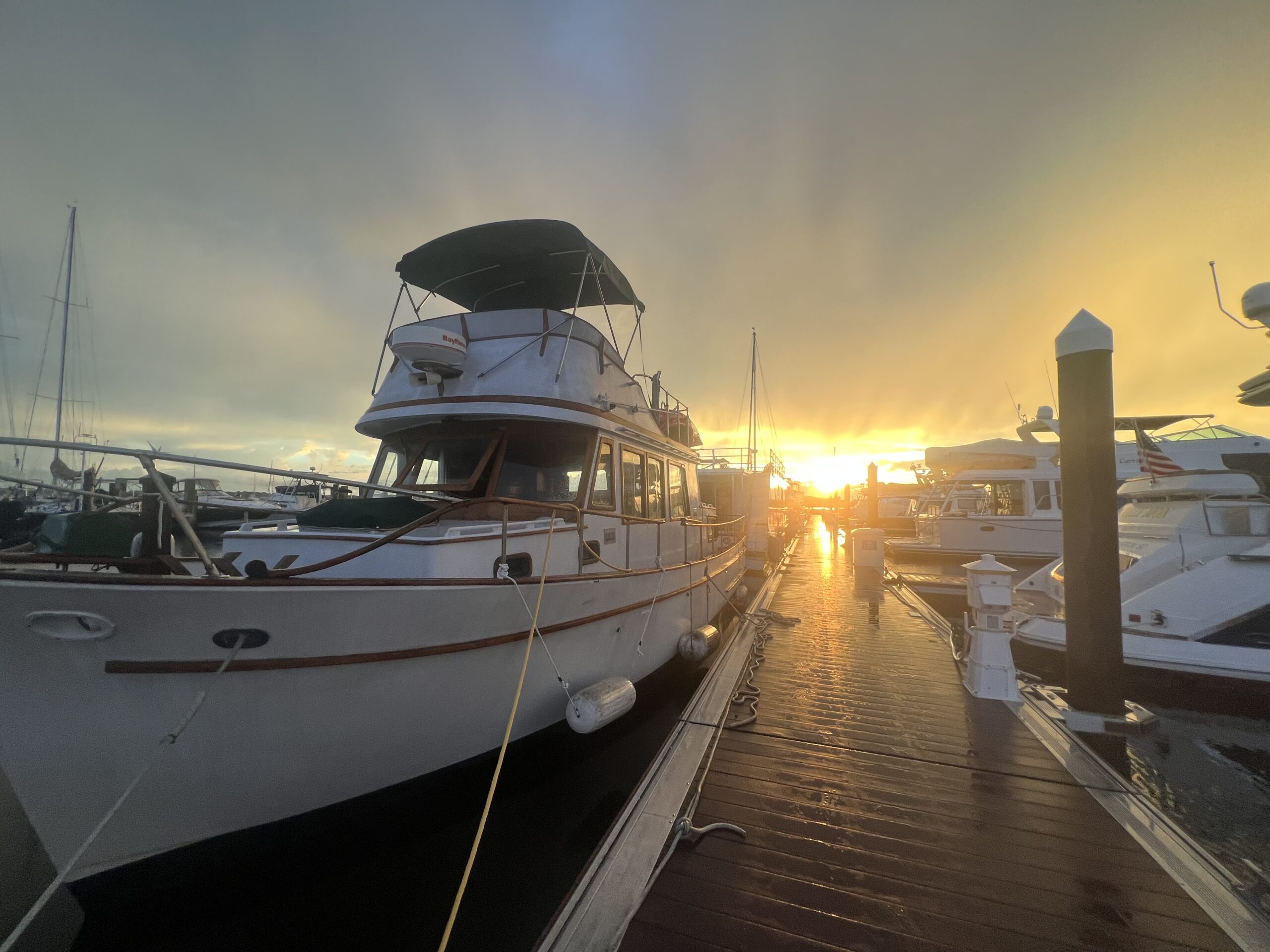 Mike and I have keys to a 1979 36′ Marine Trader Trawler and I’m in love with it!! It’s now pouring and lightning and it’s hot and humid and muggy. We are plugged into shore power and had 2 fans going so I wouldn’t die of heat. We stayed up until 2:00 am cleaning. I scrubbed the grose off of everything I could. Mike was doing maintenance checks and preparing for departure the next am.