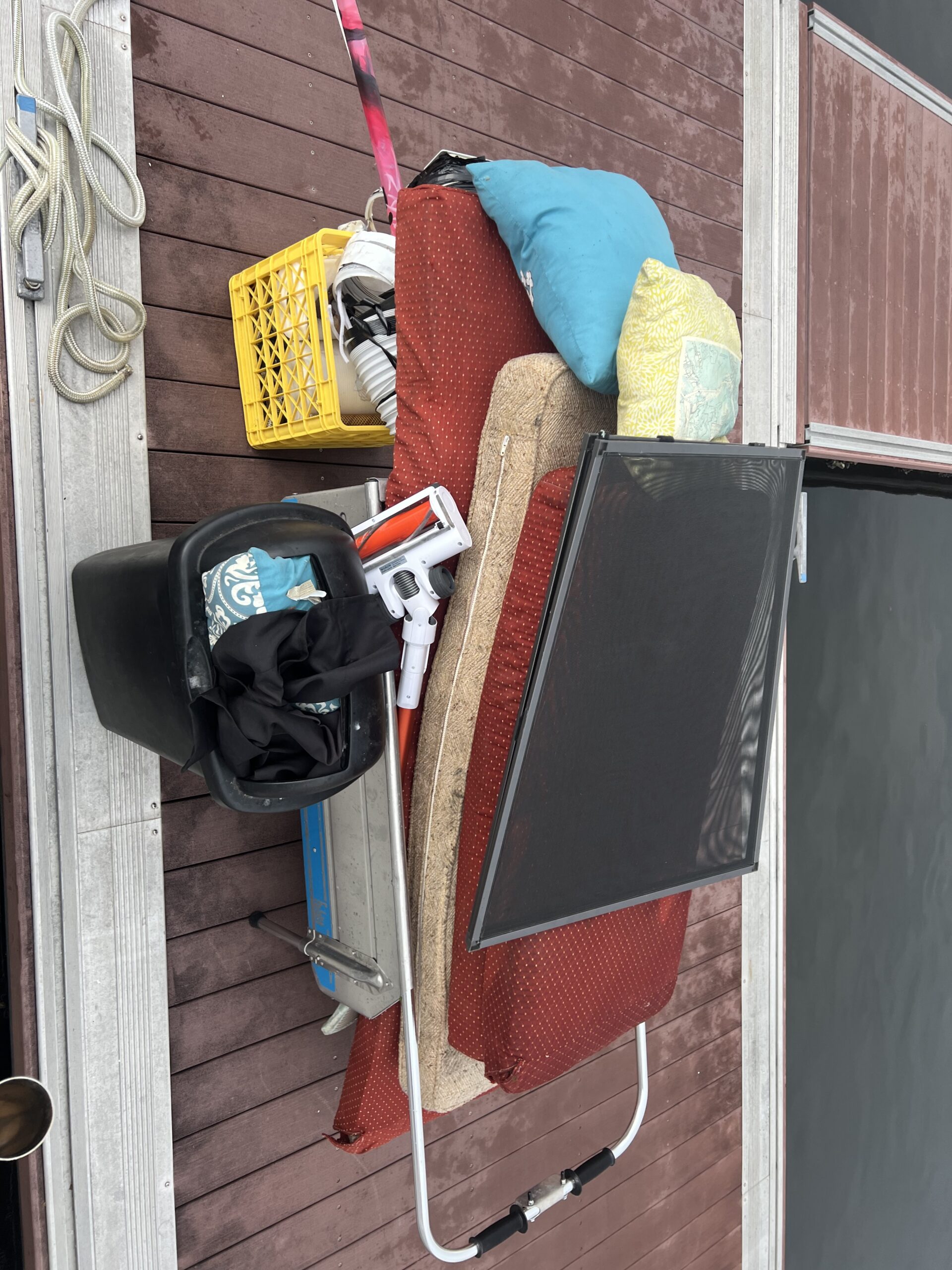 Carey approaches and I very calmly say “this should have all been done already” as I point to the 2 marina carts overflowing with crap. He says to me “we are tired of your games, it seems like you don’t want to buy the boat”. I’m trying my hardest now to not look like white trash and lose my shit! I’m like are you freeeeeeeeeking kidding me? I just had a surgical procedure today, Mike just worked all day (I lied, he had the day off) we just drove 2 hours in the pouring rain to get here and you think we are playing games. I said I’m literally holding a check in my hand for you. He turns around and walks away. He literally walked off the dock like a 5-year-old little boy taking his ball and going home. Below is a sample of the crap left. He tried to say it all goes with the boat.